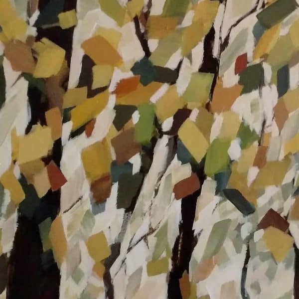New tree painting by Holly Van Hart – Slipping Between the Notes – 36 x 48 inch acrylic painting on canvas | Forest spring green yellow
