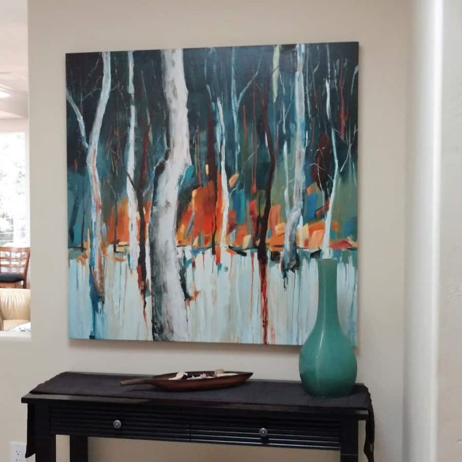 landscape forest trees | blue white orange red brown | Installed painting by Holly Van Hart | As featured in the Huffington Post and Professional Artist Magazine