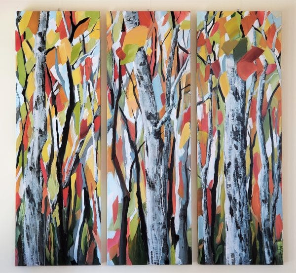 aspen forest painting by American artist Holly Van Hart | autumn red yellow orange gray | as featured in Professional Artist Magazine