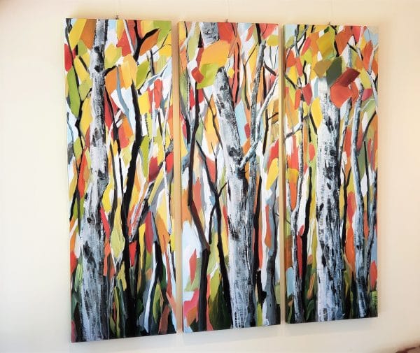 aspen forest painting by American artist Holly Van Hart | autumn red yellow orange gray | as featured in Professional Artist Magazine