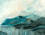 Mountains, sea, sky in blue, orange and gray, mixed media painting by Holly Van Hart | abstract flow technique